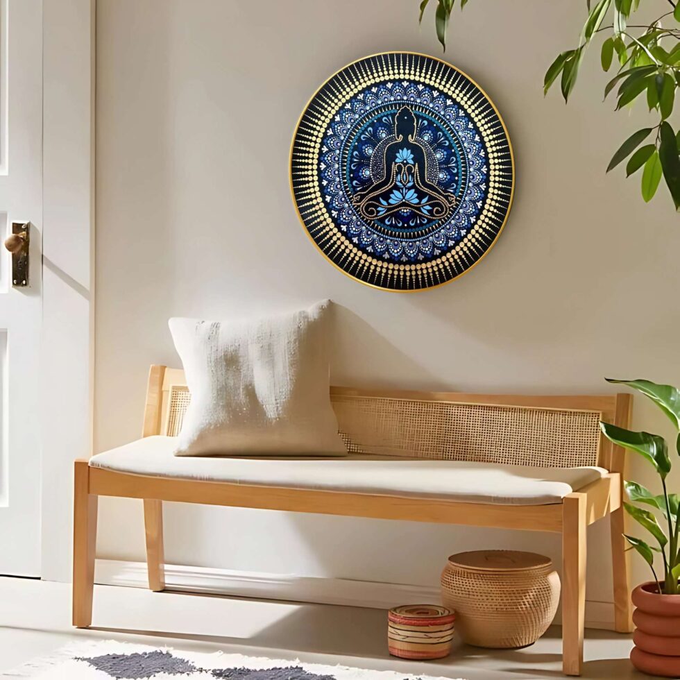 This captivating wall painting seamlessly blends traditional artistry with contemporary design, making it a perfect addition to any modern living space. Crafted with meticulous attention to detail, it features intricate patterns and vibrant colors that evoke a sense of harmony and cultural richness. Ideal for enhancing the ambiance of your home or office, this artwork serves as a testament to timeless craftsmanship and artistic expression.